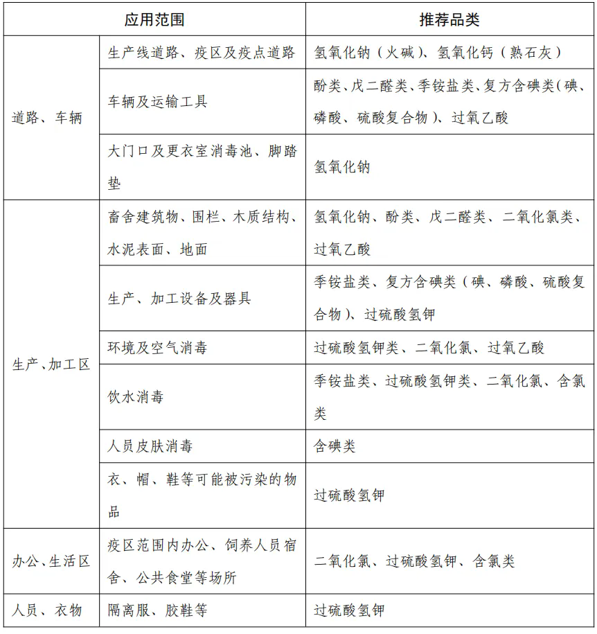 備注:1.氫氧化鈉、氫氧化鈣消毒劑,可采用1%工作濃度;2.戊二醛類、季銨鹽類、酚類、二氧化氯消毒劑,可參考說明書標明的工作濃度使用,飲水消毒工作濃度除外;3.含碘類、含氯類、過硫酸氫鉀消毒劑,可參考說明書標明的高工作濃度使用。