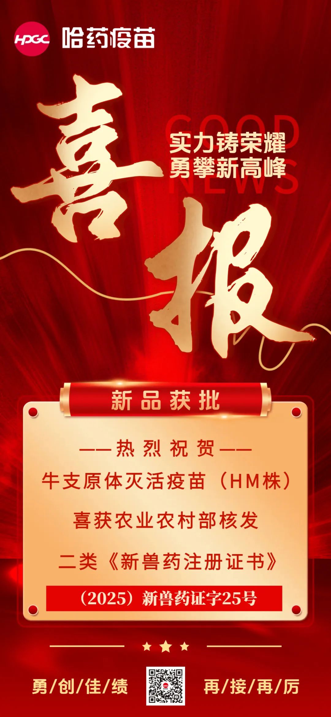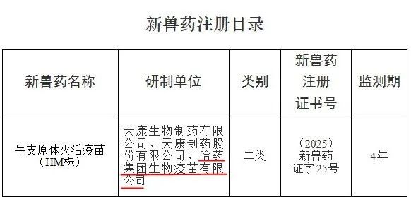 根據(jù)《獸藥管理?xiàng)l例》和《獸藥注冊(cè)辦法》規(guī)定,經(jīng)農(nóng)業(yè)農(nóng)村部審查,批準(zhǔn)哈藥集團(tuán)生物疫苗有限公司申報(bào)的“牛支原體滅活疫苗(HM株)”為新獸藥,并于2025年03月28日公示并核發(fā)了《新獸藥注冊(cè)證書》。
