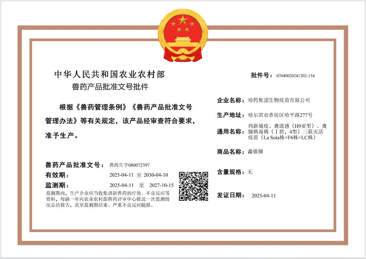 公司新產(chǎn)品“ 雞新城疫、禽流感(H9亞型)、禽腺病毒。↖群,4型)三聯(lián)滅活疫苗(La Sota株+F6株+LC株)”批準(zhǔn)文號于2025年4月11日獲農(nóng)業(yè)農(nóng)村部核發(fā)。